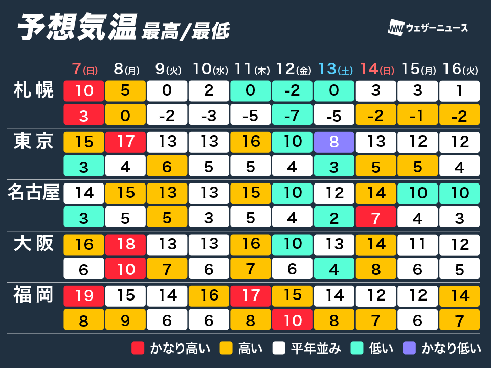 12日(金)の予想最高気温は札幌で−2℃の真冬日、東京や大阪でも1月上旬並みの10℃となる見込みです。