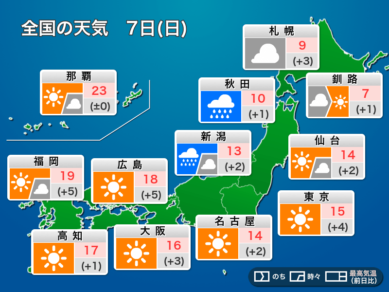 関東以西の太平洋側や沖縄は晴れて穏やかな日曜日になりそうです。気温も昨日までと比べて上昇し、小春日和になります。年末に向けた家の片付けや大掃除、庭の手入れなどを進めるにはちょうど良い一日になりそうです。