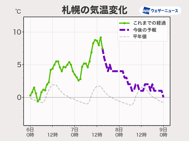 札幌の予想最高気温は4℃ですが、これは日付が変わった直後に観測される予想で、昼間は1~2℃程度で推移する予想です。今日との体感差も大きくなるので万全の防寒が欠かせません。