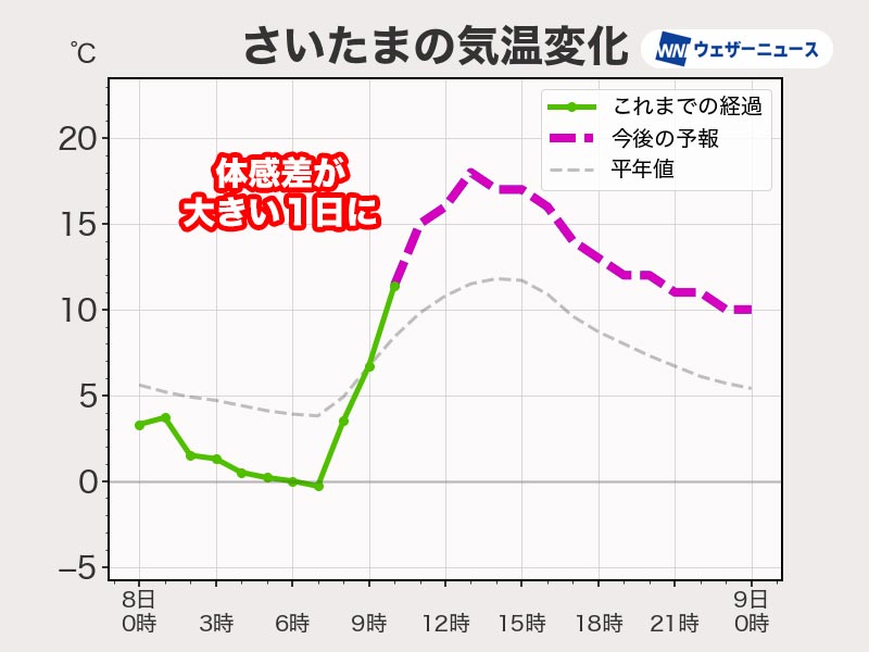 最高気温は15℃を超えるところが多く、日差しが暖かく感じられそうです。体感の変化が大きい一日となりそうです。