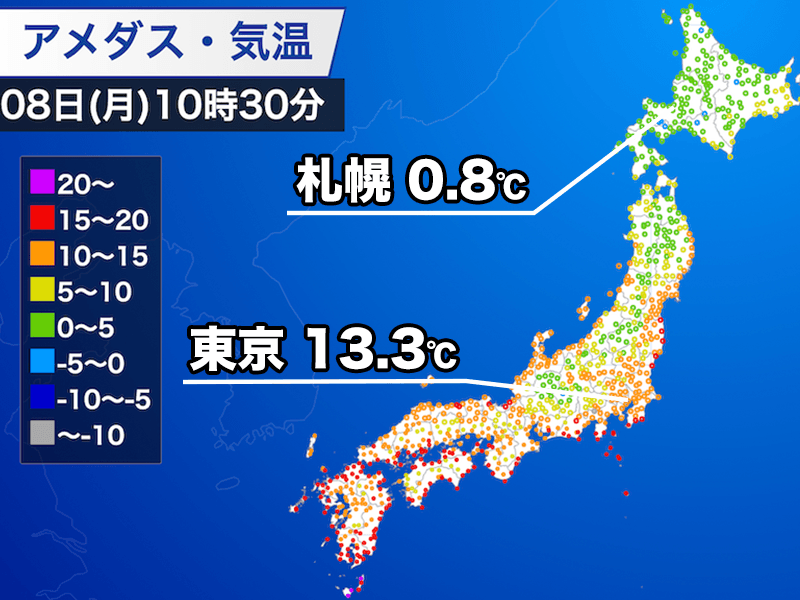 今日8日(月)10時30分の気温は、福岡16.3℃、大阪12.6℃、名古屋10.5℃、東京13.3℃となっています。今朝は関東甲信を中心に冷え込みましたが、昼間は青空が広がり気温が上昇しています。朝は氷点下の冷え込みとなったさいたま市では、10時30分の気温が12.9℃と朝より13℃以上も上がりました。