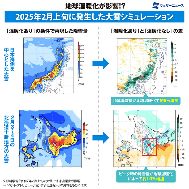 文部科学省気象庁気象研究所「令和7年2月上旬の大雪に地球温暖化が影響-イベント・アトリビューションによる速報-」、文部科学省及び気象庁「日本の気候変動 2025 ― 大気と陸・海洋に関する観測・予測評価報告書 ―」、Hiroaki Kawase, Akihiko Murata, Ryo Mizuta, Hidetaka Sasaki, Masaya Nosaka, Masayoshi,Ishii, Izuru Takayabu, 2016:Enhancement of heavy daily snowfall in central Japan due to,global warming as projected by large ensemble of regional climate simulation. Climatic,Change, 139(2), 265-278.