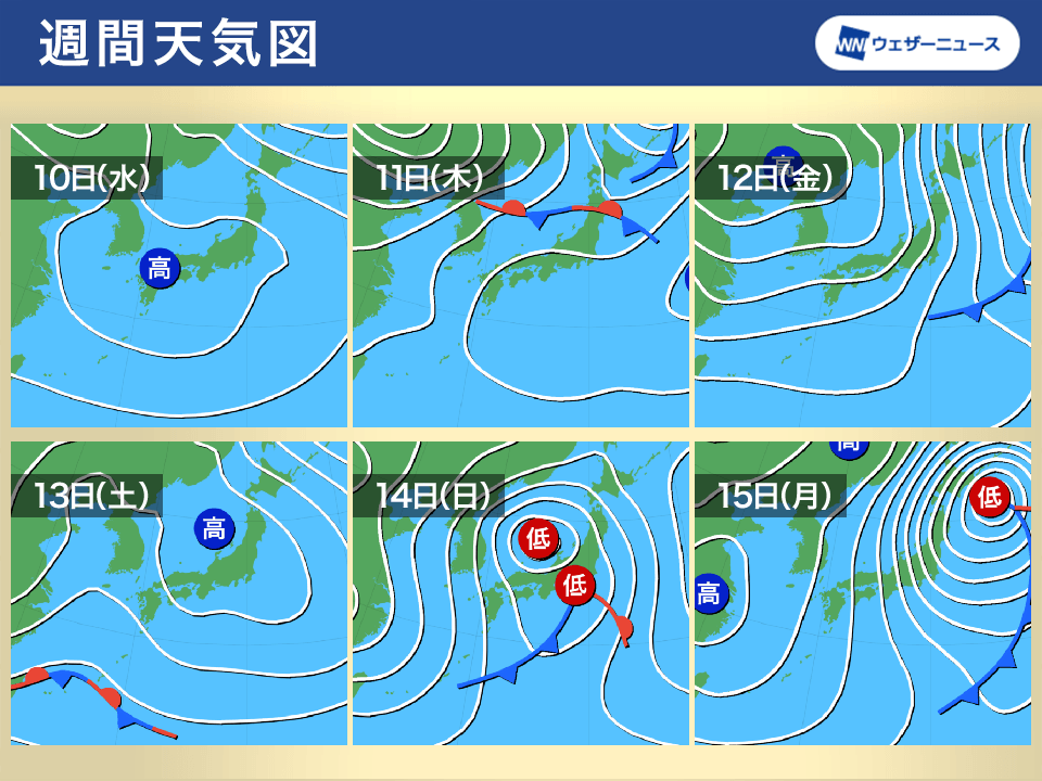 13日(土)〜14日(日)は低気圧が発達しながら日本付近を東進する予想です。