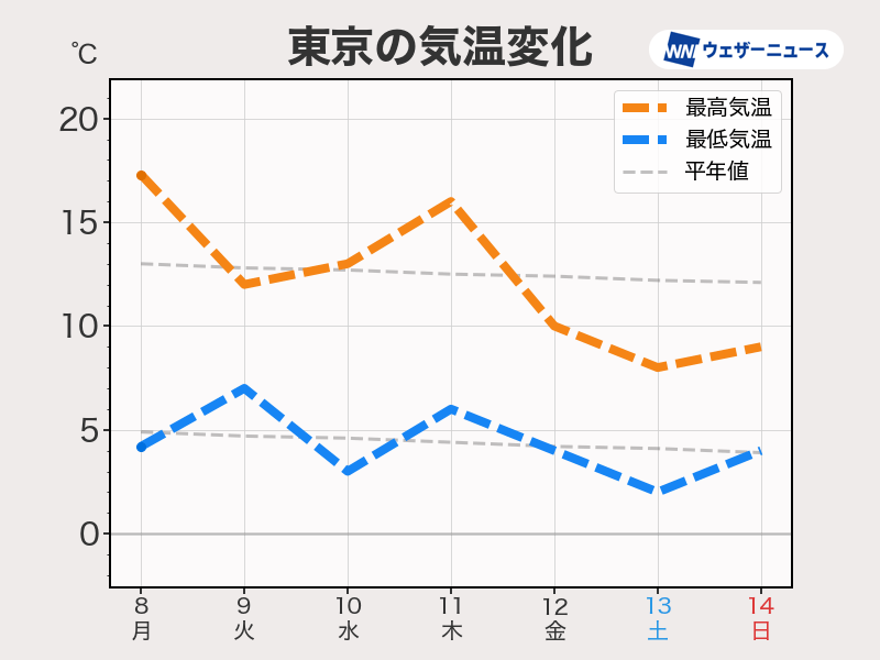 東京都心でも12日(金)〜14日(日)は最高気温が10℃に届かない予想です。