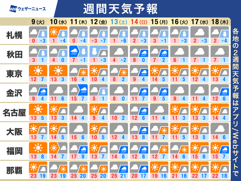週前半は一旦寒気が弱まるものの、12日(金)から13日(土)にかけては強い寒気が再び南下して広く真冬の寒さになります。