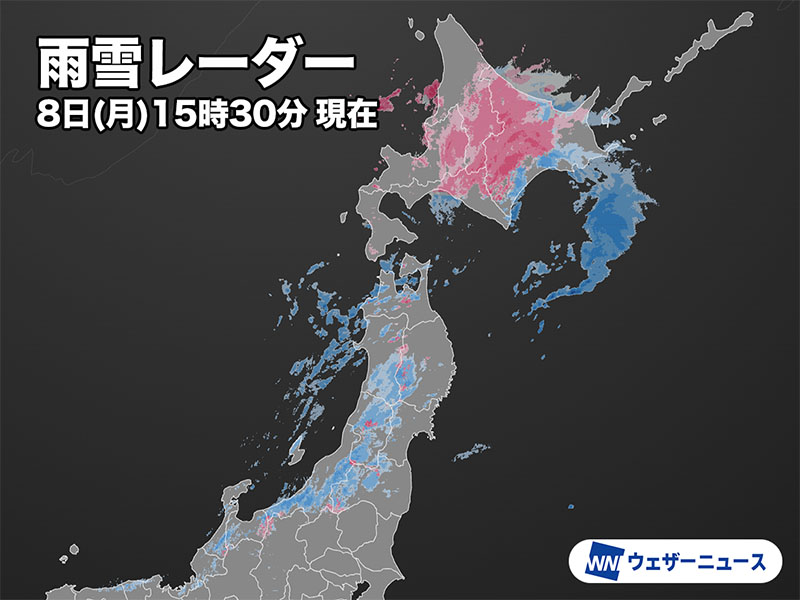今日8日(月)は北海道付近を低気圧が東に進み、そこからのびる寒冷前線が東北や北陸を通過しています。このため、北日本や北陸から山陰の各地で天気が雨や雪が降りました。