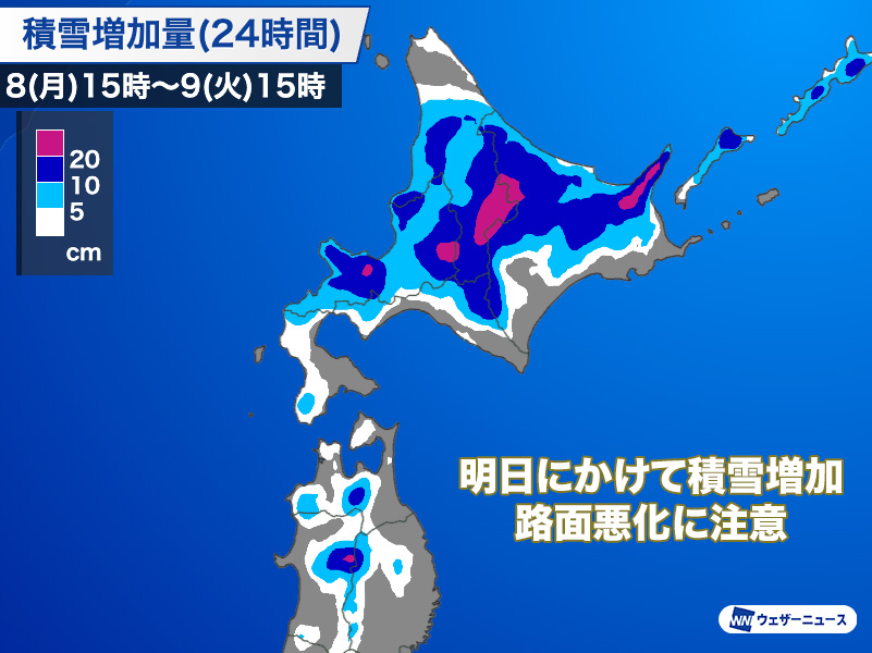明日9日(火)にかけて北日本各地で積雪が増すおそれがあるので、路面の悪化に注意してください。