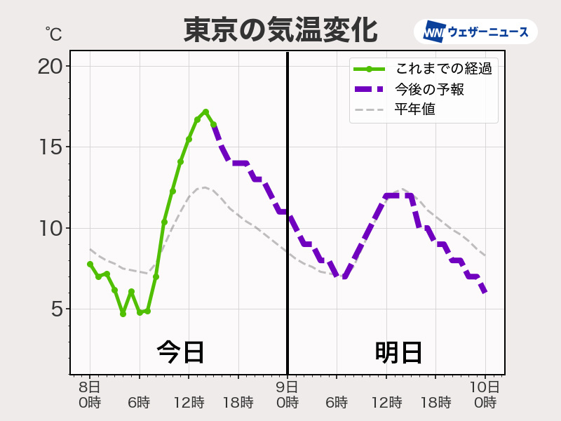 関東から西の太平洋側は晴れるところが多い見込みです。昼間の気温は今日より低くなる予想です。日差しの温もりはあるものの、風が冷たく感じられそうです。