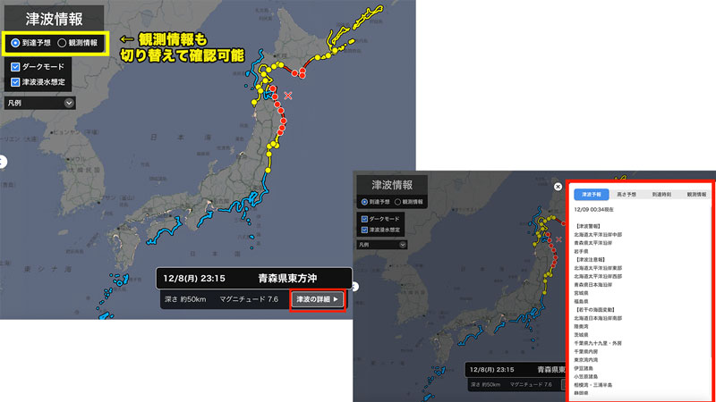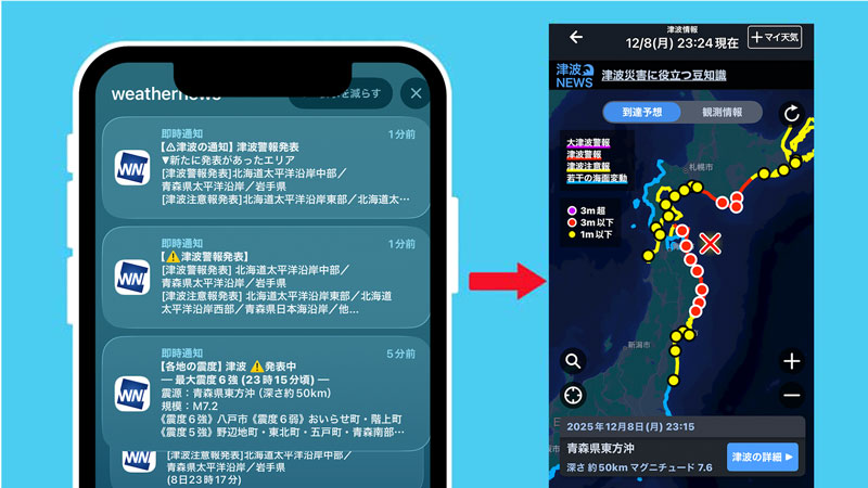 【地震・津波情報の見方】ウェザーニュース for businessやアプリで確認(2025年12月8日〜9日の事例)