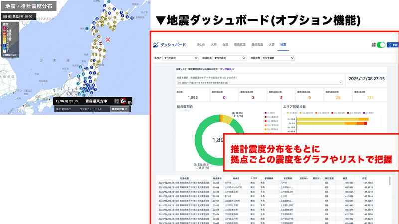 また、オプション機能として、地震のダッシュボードをご用意しています。推計震度分布をもとに、拠点ごとの震度をグラフやリストで把握できます。
