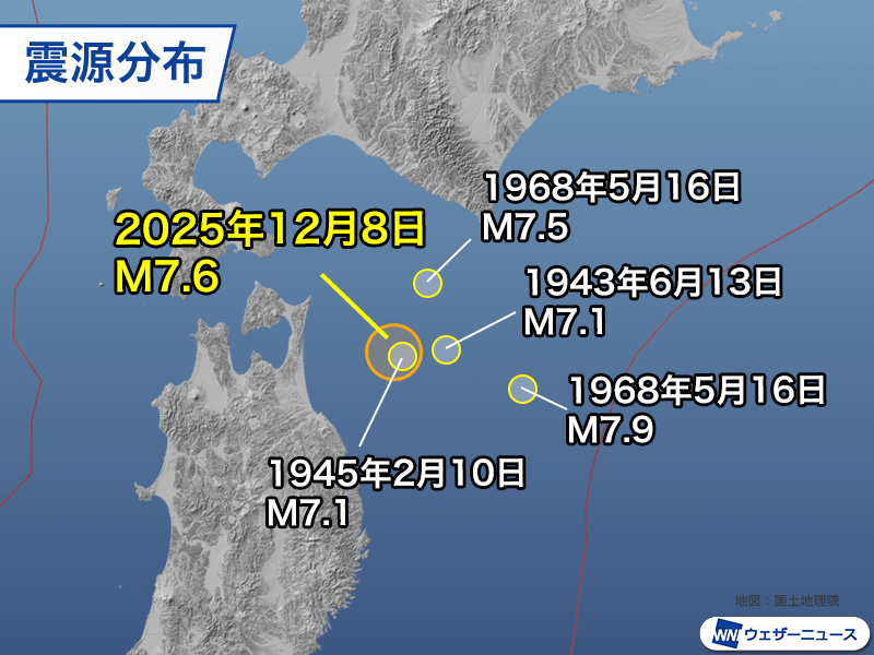 青森県東方沖を震源とするマグニチュード7以上の地震は1968年の5月16日以来、57年ぶりになります。(この日に2回発生した地震のうち、マグニチュード7.9のものは、1968年十勝沖地震と名称が定められています)