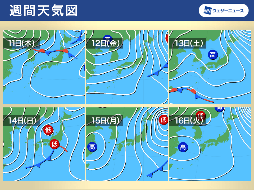 週末の13日(土)から14日(日)は低気圧が発達しながら日本付近を東進する予想です。