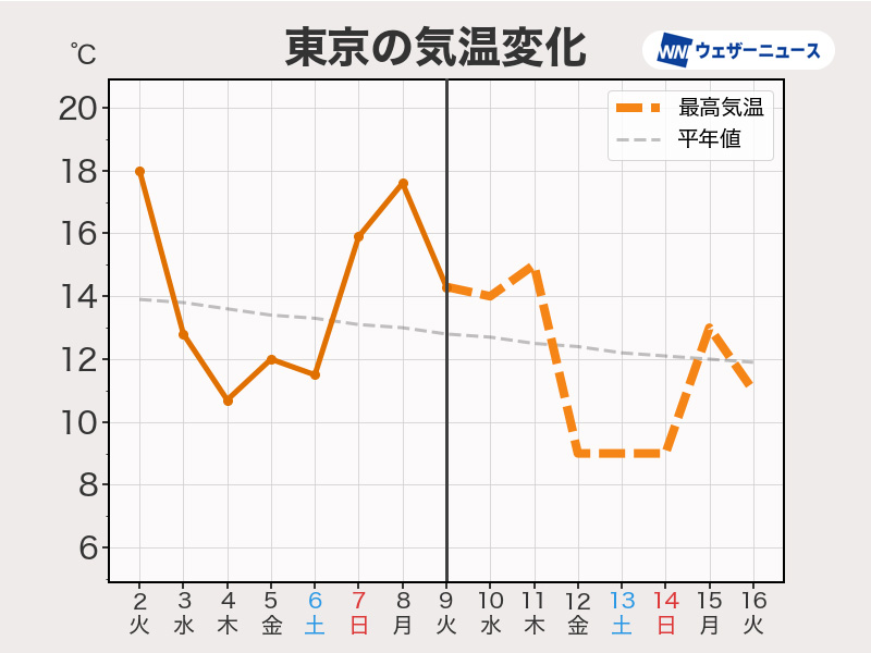 東京都心でも12日(金)〜14日(日)は最高気温が10℃に届かない予想です。