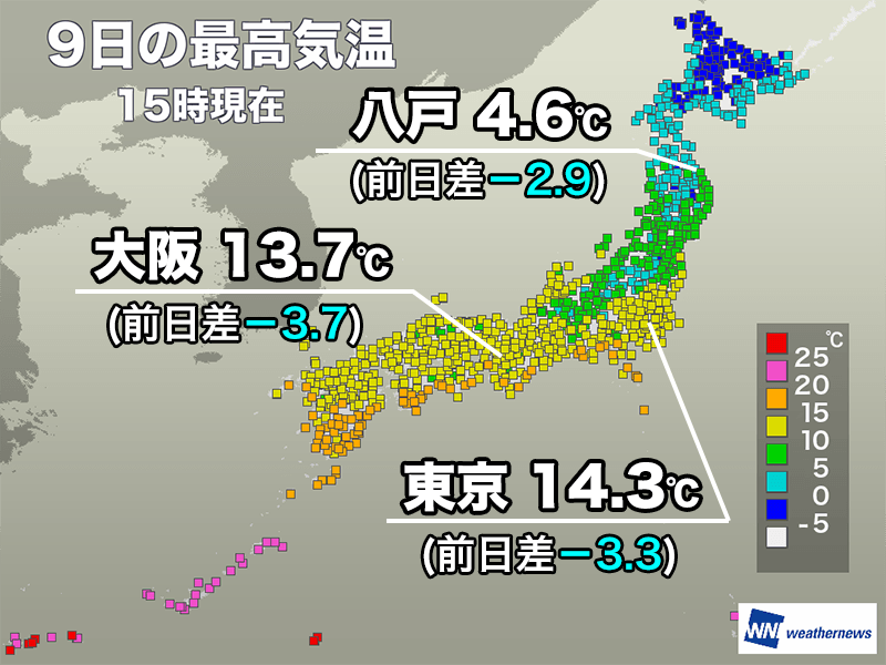 15℃を超えたのは東海から九州の太平洋沿岸に限られ、15時までの最高気温は東京都心で昨日よりも3.3℃低い14.3℃、大阪市は3.7℃低い13.7℃、福岡市は3.1℃低い14.7℃に留まっています。