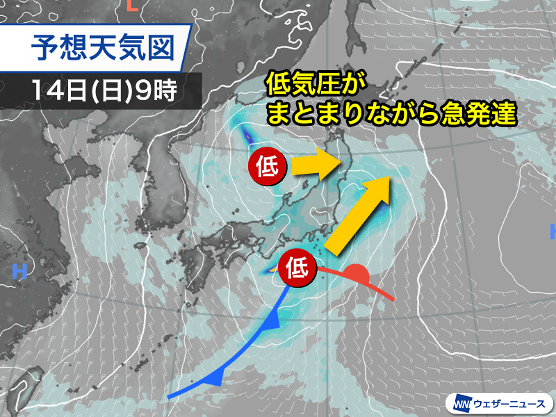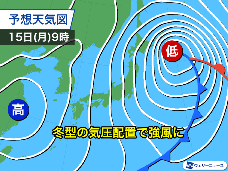 2つの低気圧は15日(月)にかけて一つにまとまりながら、三陸沖で急速に発達します。西から冬型の気圧配置へと変わっていく予想です。