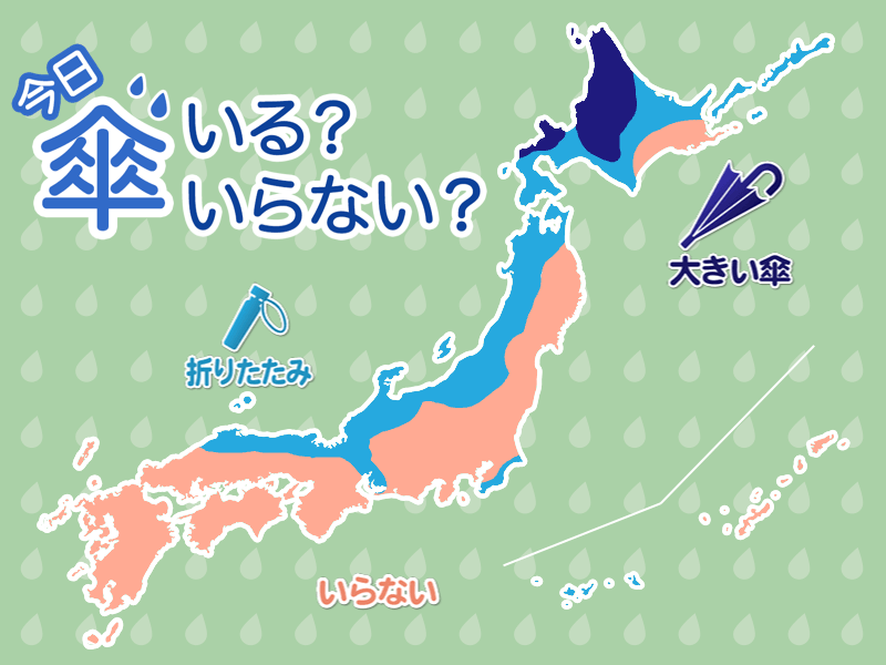 東北日本海側や北陸は雨や雪の降るところがあり、北陸では雷や霰(あられ)を伴う可能性もあります。房総の沿岸や名古屋周辺、沖縄の先島諸島もにわか雨が心配です。外出の際は折りたたみ傘があると安心です。