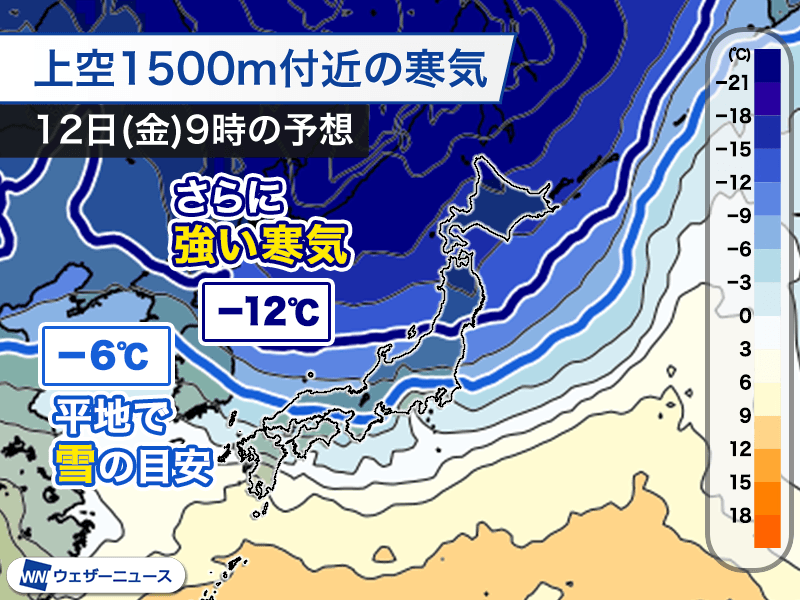 低気圧通過後は12日(金)にかけて強い冬型の気圧配置となり、この冬これまでで最も強い寒気が南下します。被災地周辺は時々雪が降り、強風で吹雪になるおそれがあります。