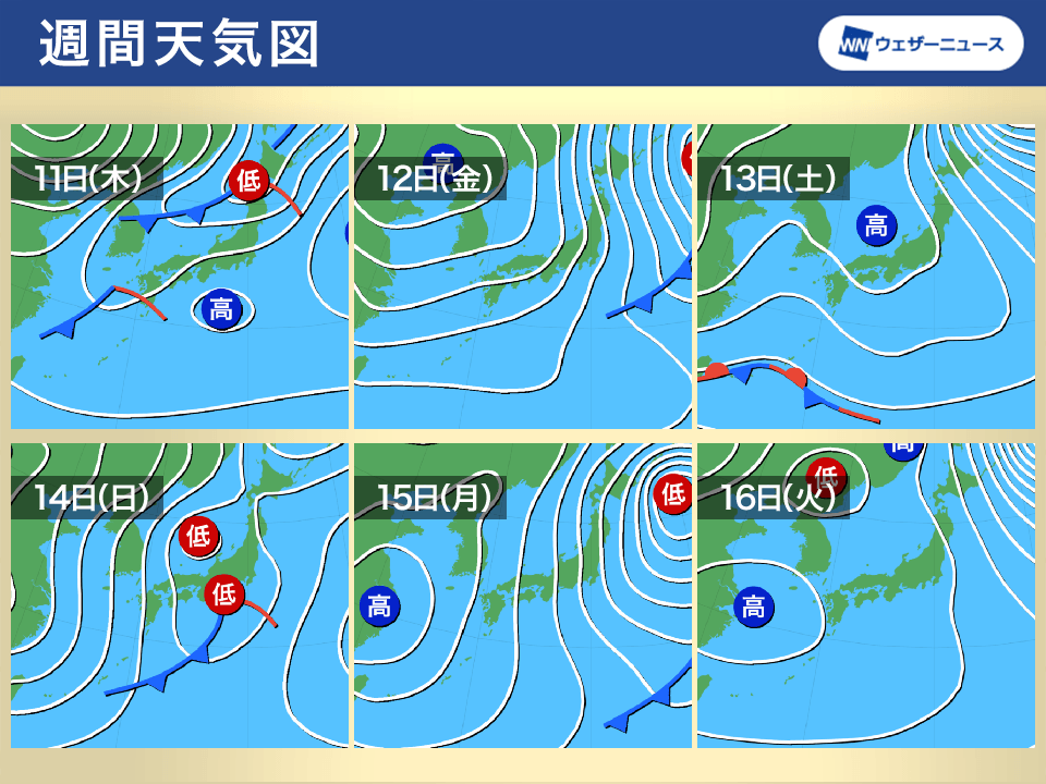 明日11日(木)以降は日本付近を低気圧が次々と通過。短い周期で荒天となるおそれがあり、警戒が必要です。