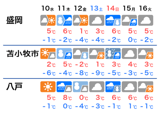 今日10日(水)は岩手県や青森県の一部でチラチラと雪が降っているところがあるものの、午後には回復傾向で復旧作業には問題ない天気になる予想です。