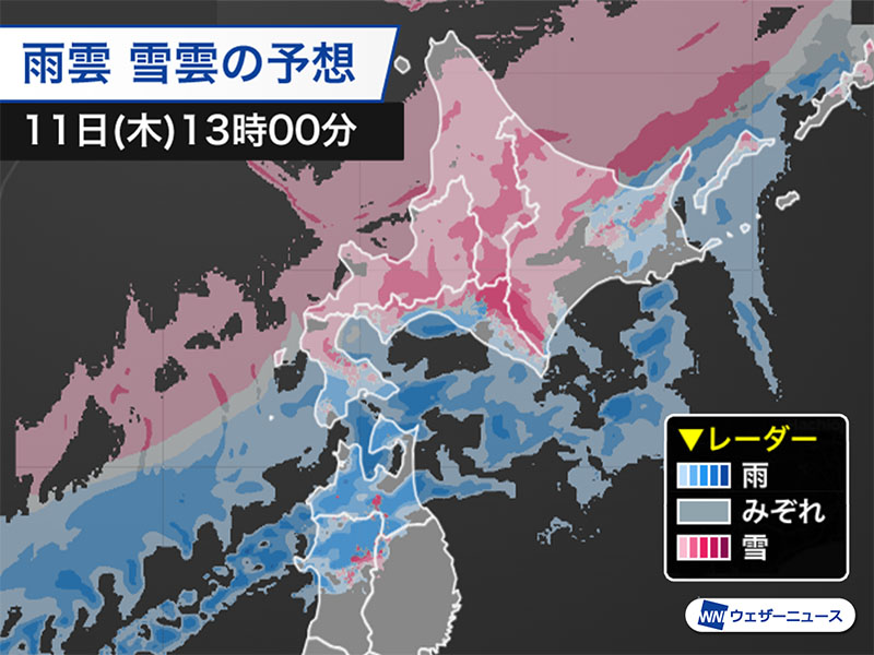 北海道では湿った雪、東北平野部では雨が降る時間がが長くなる予想です。北海道では一時的に雪が強まり、内陸山沿いでは大雪となるおそれがあります。吹雪による視界不良にも注意が必要です。