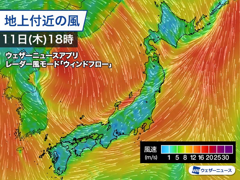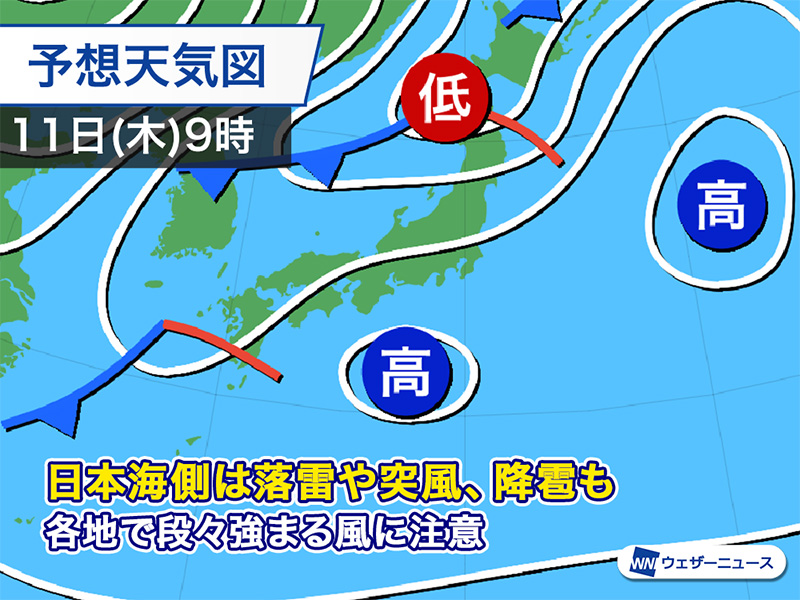 前線通過時には一時的に雨が強まり、日本海側を中心に落雷や突風、降雹の可能性もあります。風も徐々に強まるので横殴りの雨にも注意が必要です。