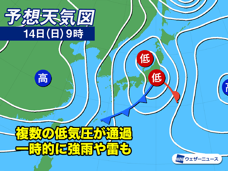 14日(日)になると本州南岸の前線上に低気圧が発生して東に進み、日本海にも別の低気圧が発生して東に進みながら本州に接近します。