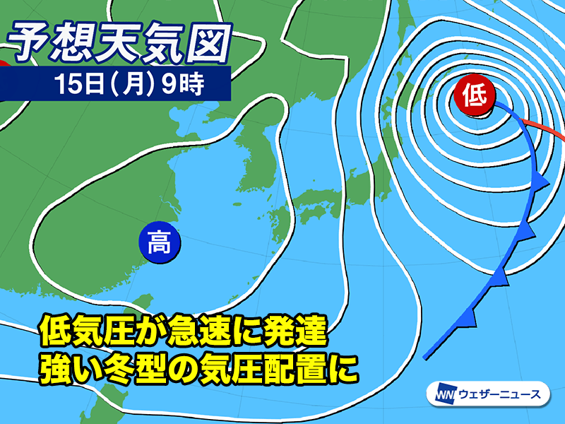 日本海と本州南岸の低気圧は週明けの15日(月)になると三陸沖で1つにまとまり急速に発達します。日本の周辺は強い冬型の気圧配置となり、日本海側を中心に雨や雪が降る予想です。