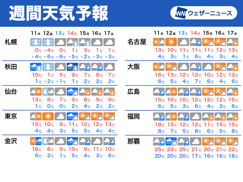 今日・明日〜2週間先までの週間天気予報今日・明日〜2週間先までの週間天気予報