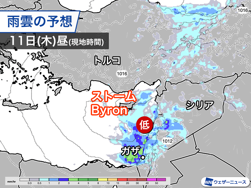 ストームByronはギリシャに大雨をもたらした後、地中海をゆっくりと東に進んできました。イスラエルでは現地時間に10日(水)から活発な雨雲がかかりはじめ、ベン・グリオン空港では10日(水)夕方までの24時間に40mmほどの雨を観測しています。