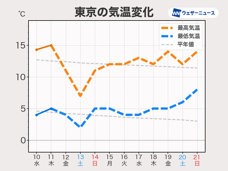 東京都心では12日(金)〜14日(日)にかけて平年を下回り、寒気のピークとなる13日(土)は最高気温が10℃に届かない予想です。週末にかけて広い範囲で真冬並みの寒さとなるため、外出の際はしっかり防寒してお出かけください。