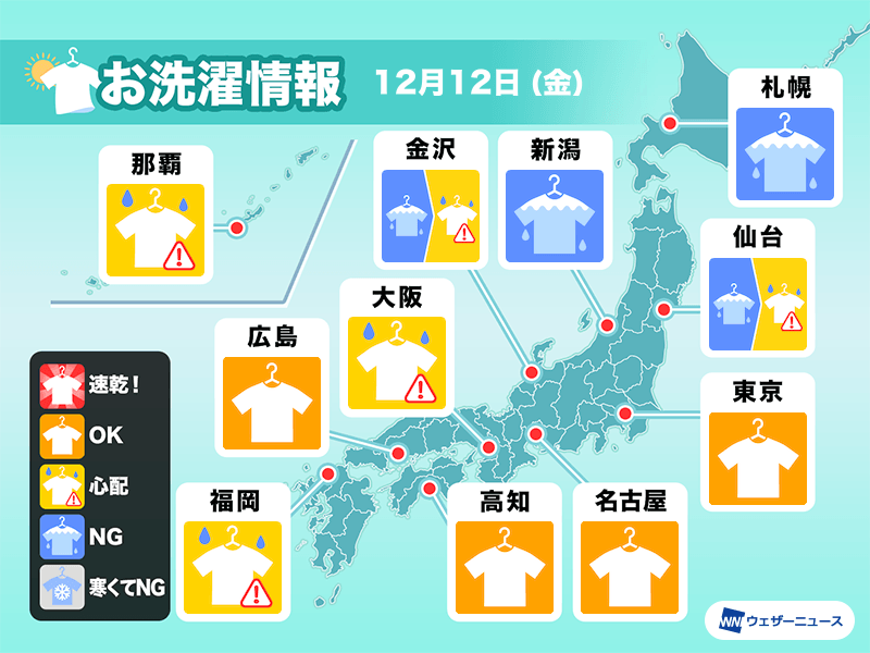 東北太平洋側や静岡県、近畿、山陽、九州北部、南西諸島は、日差しが届いてもにわか雨の可能性があります。長時間外出する場合は、室内干しが安心です。