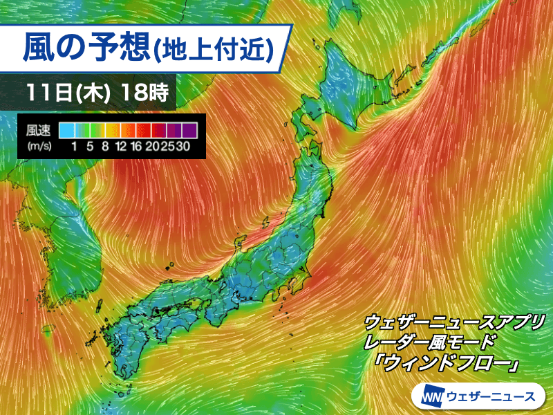 低気圧や前線の東進に伴って、午後は強風の範囲が拡大する見込みです。関東は、昼過ぎ頃から段々と南西風が強まるとみています。飛来物や、帰宅時間の交通機関への影響に注意してください。