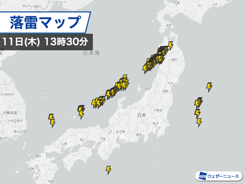 東北から日本海には、寒冷前線がのびています。周辺では大気の状態が不安定で、局地的に雨雲が発達し、秋田県藤里町では13時50分までの1時間に20.0mmの強い雨を観測しました。落雷も頻発しています。