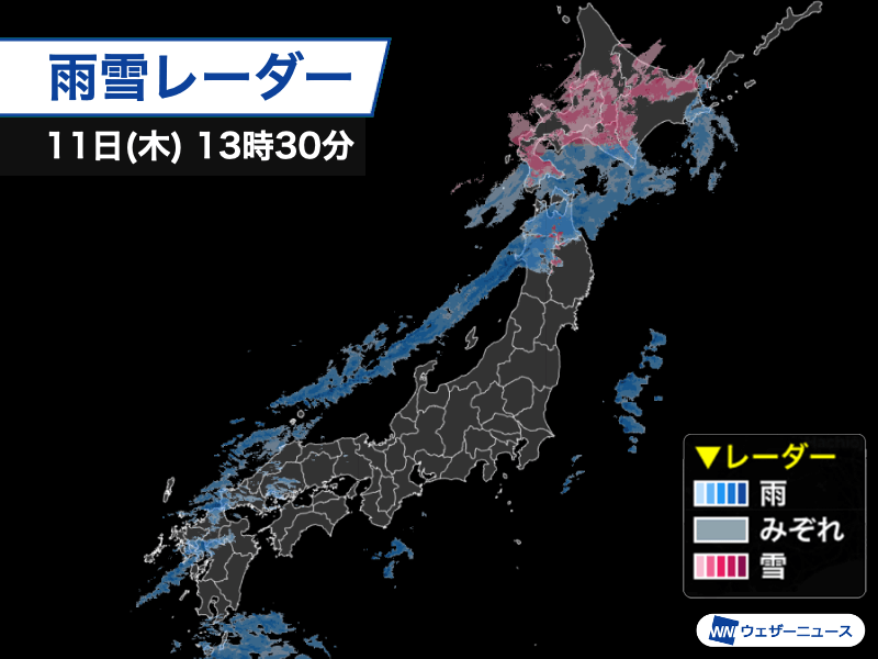九州や中国地方は、シアライン(風の流れが変化する境界線)の影響で雨が降っています。長崎県新上五島町有川では12時56分までの1時間に23.5mmの強い雨を、長崎市長浦岳では13時50分までに12.0mmのやや強い雨を観測しました。