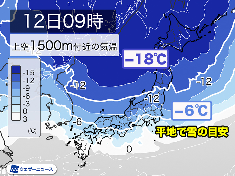 降水があれば平地で雪になる目安の上空1500m付近で−6℃以下の寒気が中四国〜関東南部まで南下し、北海道には−18℃以下という非常に強い寒気が流れ込む予想です。