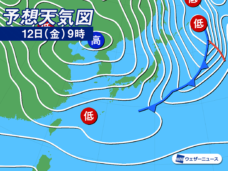 寒気の南下に伴い、全国的に今日11日(木)より気温が下がります。日付が変わってすぐの夜中に最高気温が出る所も多くなりそうです。
