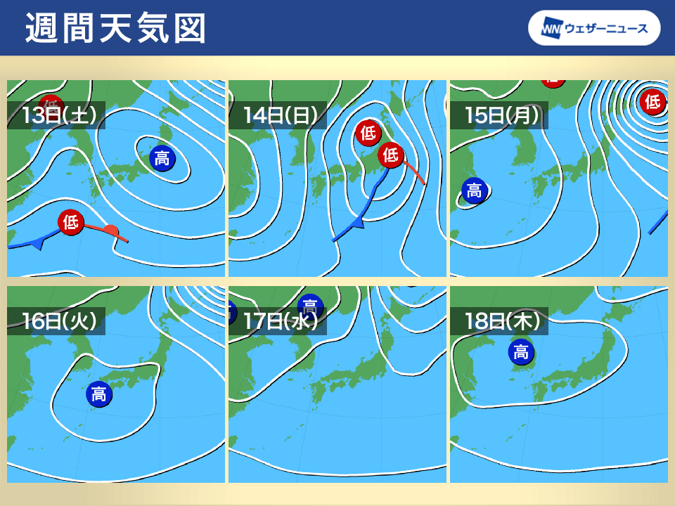 13日(土)は、前線や低気圧が発達しながら接近し、西日本や東日本の太平洋側を中心に雨が降ります。一時的に強い雨や雷、突風、霰(あられ)のおそれがあります。