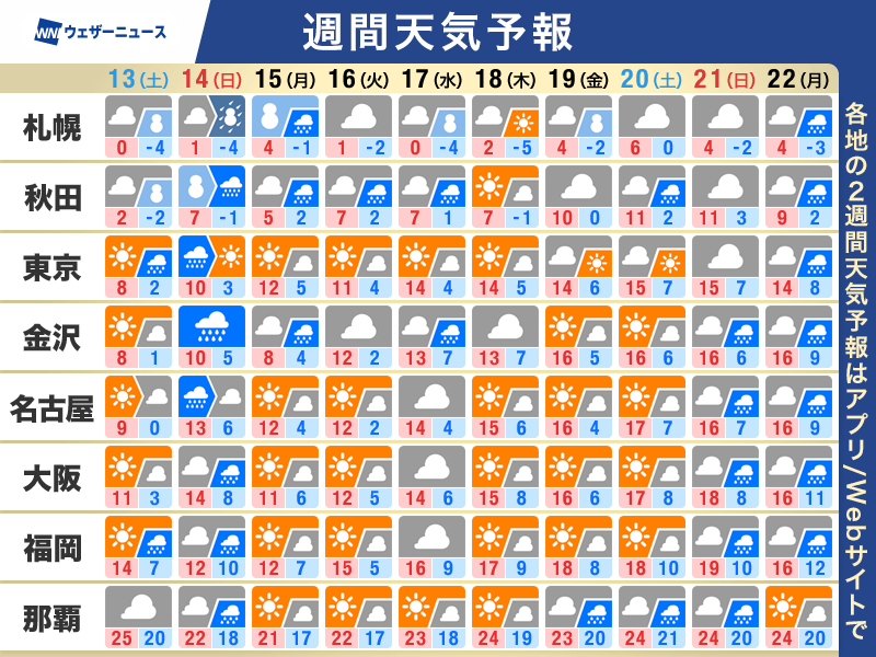 その後、14日(日)以降は寒気が徐々に北上し、来週はじめには気温が平年並み〜平年よりやや高めに戻る見通しです。真冬用の厚手アウターが活躍するのは一時的とみられますが、一日の気温差は大きい状態が続きます。引き続き体調管理をしっかりと行ってください。