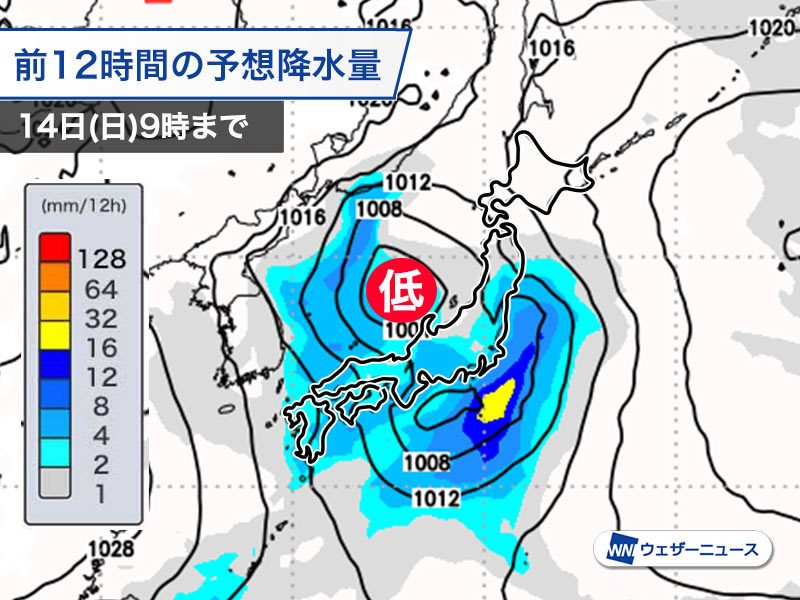 13日(土)から14日(日)にかけて、日本海と本州南岸をそれぞれ進む2つの低気圧が発達しながら北東進し、広範囲で雨や雪が降ります。北海道から東北の太平洋側では湿った大雪や冷たい雨となり、関東や東海でも一時的に激しい雨が降る可能性があります。