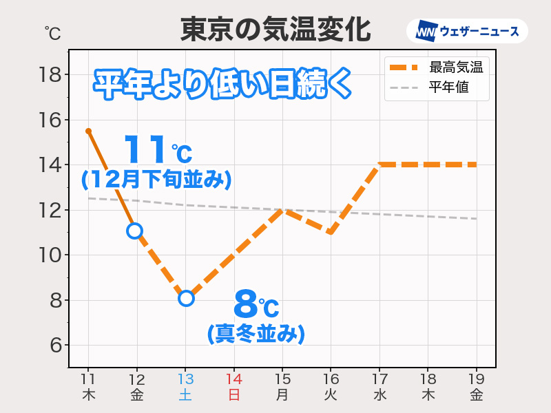 日本付近に流れ込んでいる強い寒気は、14日(日)以降は寒気が徐々に北上し来週はじめには気温が平年並み〜平年よりやや高めに戻る見通しです。真冬用の厚手アウターが活躍するのは一時的とみられますが、一日の気温差は大きい状態が続きます。引き続き体調管理をしっかりと行ってください。
