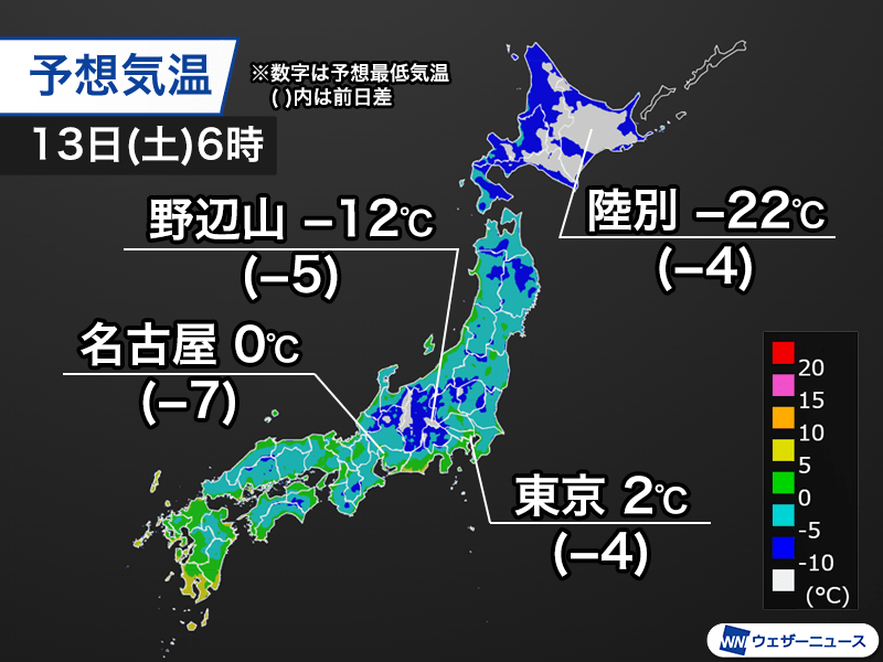 本州の標高の高い地域や北海道の道東内陸部は−10℃未満の白の領域が広がり、北海道陸別町では−22℃と、富士山以外では今冬初めての−20℃未満になるとみられます。今夜は暖かくしてお過ごしください。