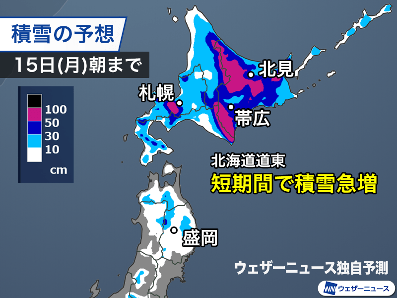 道東の太平洋側では15日(月)の未明まで、オホーツク海側では昼頃まで強い雪が続いて、短期間で一気に積雪が増加します。