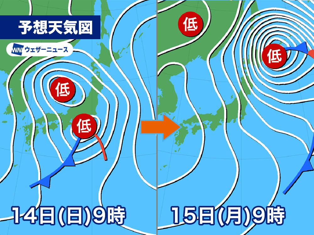 今日9時の時点で1000hPaと予想される低気圧の中心気圧は、明日15日(月)朝には976hPaと急速な発達が予想されています。