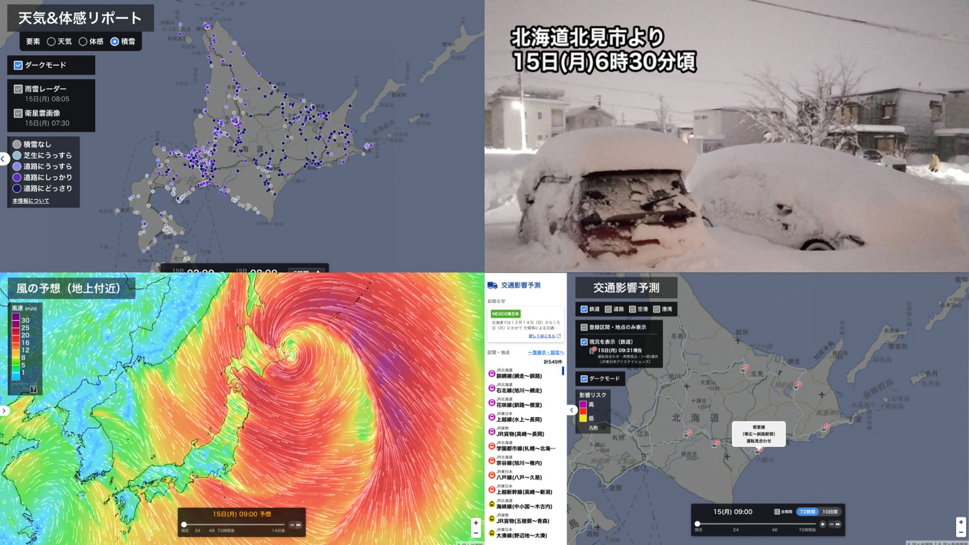 週の始まりとなった15日(月)、北海道は強い冬型の気圧配置の影響で大荒れの天気となりました。上空に強い寒気が流れ込んだことで、各地で大雪に見舞われたほか、沿岸部を中心に暴風警報・注意報が発表されました。