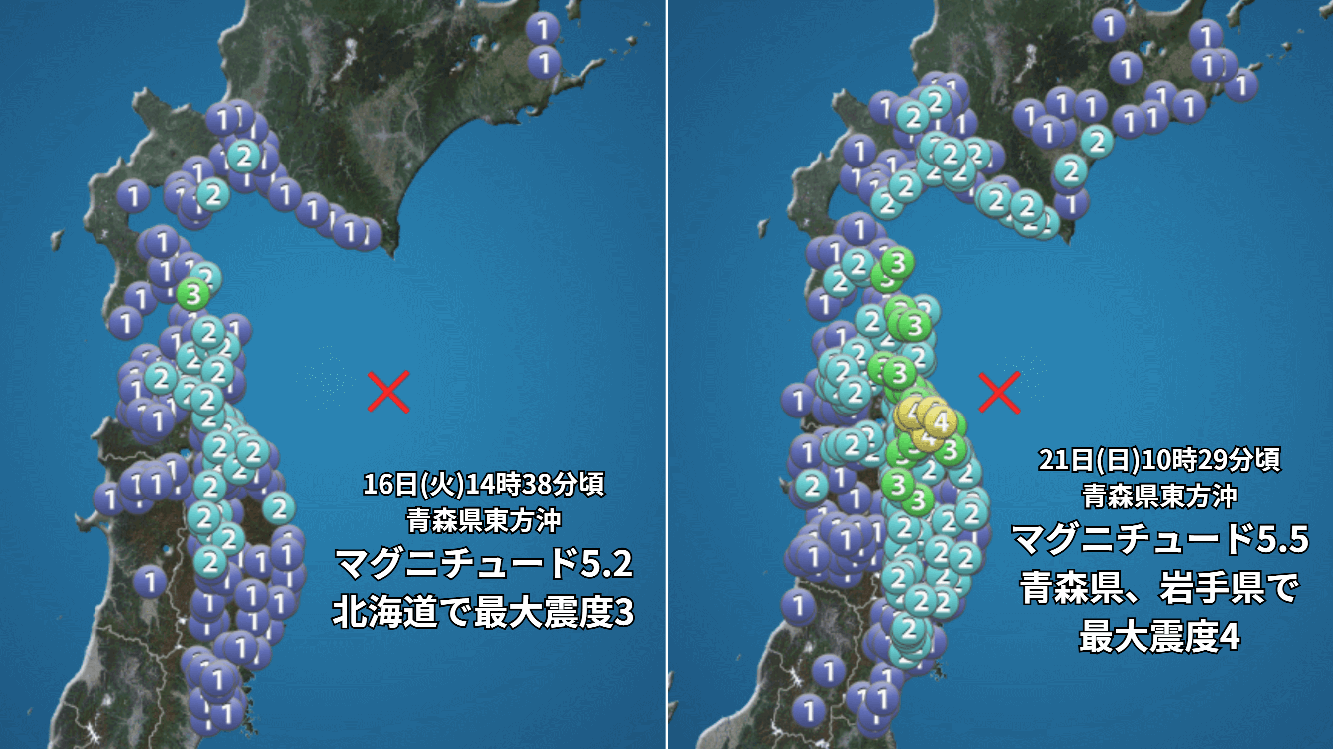 21日(日)10時29分頃:マグニチュード5.5、青森県、岩手県で最大震度4を観測。