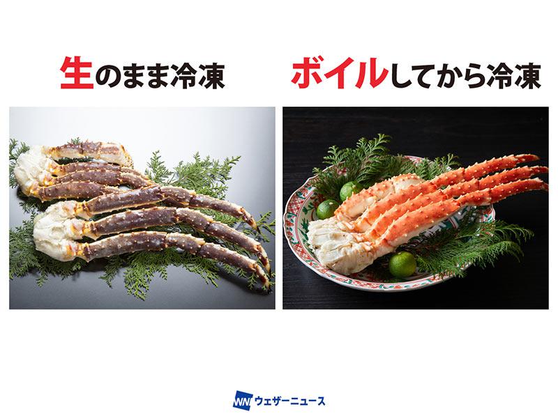 ズワイガニもタラバガニも、生の状態のものは色が黒っぽいくすんだ色をしていますが、加熱すると赤く色が冴えます。これはカニに含まれるアスタキサンチンという物質が加熱により赤くなるためです。つまり、くすんだ色は生を冷凍、赤いものは加熱してから冷凍されたものということです。