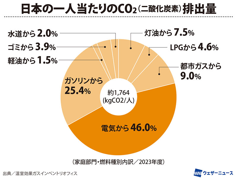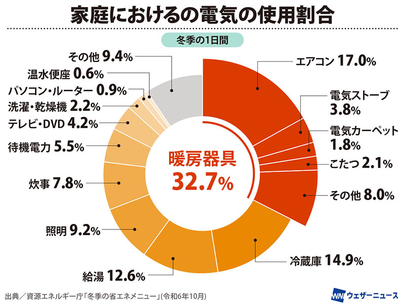 家庭における冬の電気の使用割合は暖房がトップ