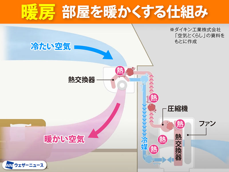 まず、エアコン暖房はどんな仕組みで部屋を暖かくしているのですか。