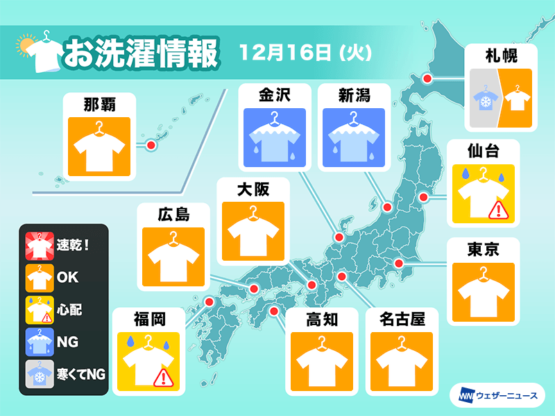 東北日本海側や北陸は、朝に雨や雪が降っていないところでも雨や雪が心配です。洗濯物は部屋干しをおすすめします。北海道は気温が低いので部屋の中で乾かすのがよさそうです。