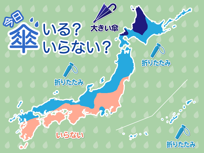西日本の日本海側や沖縄、伊豆半島周辺もにわか雨が心配です。外出の際は念のため折りたたみ傘があると安心です。